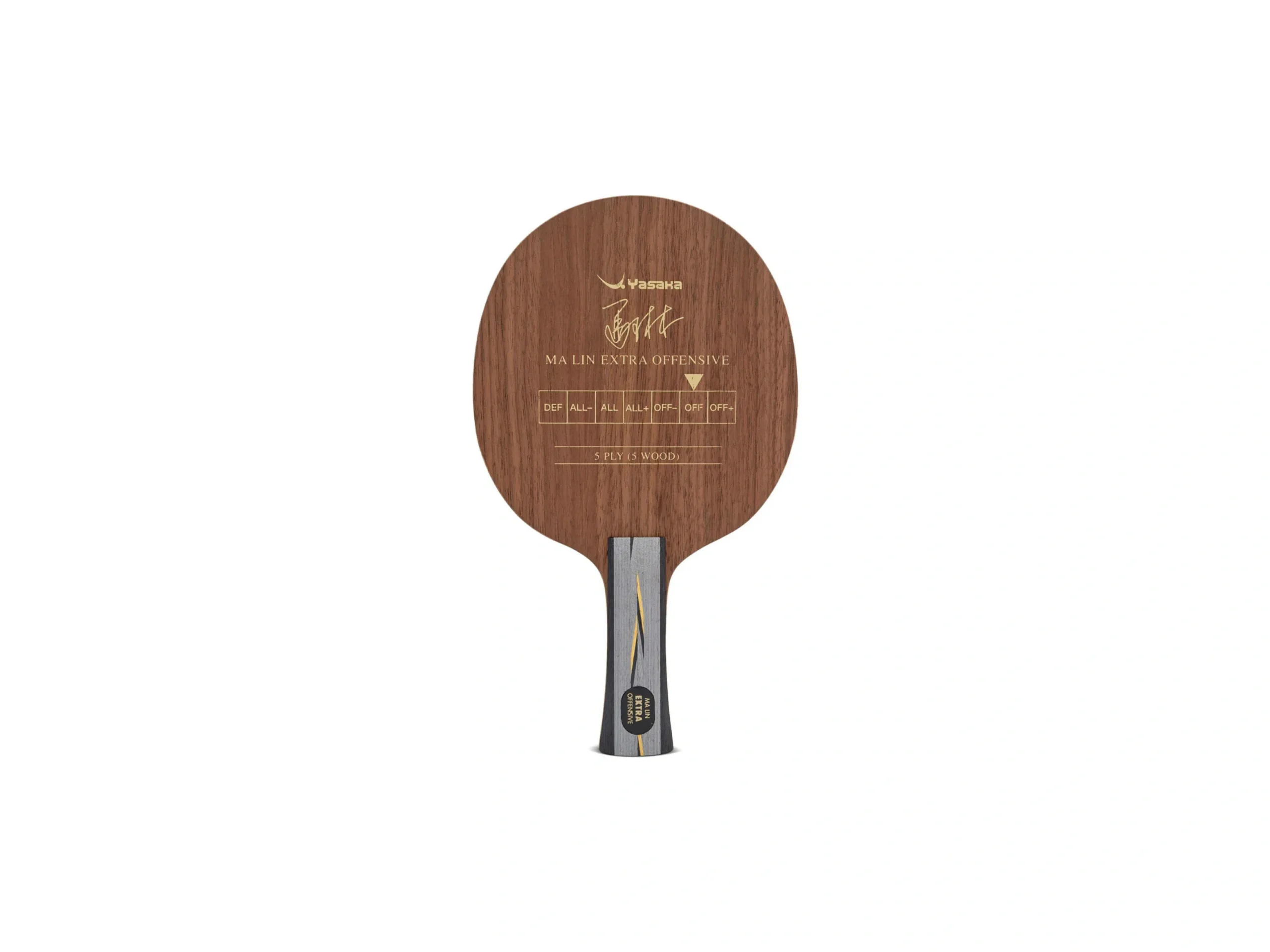 Yasaka Ma Lin Extra Offensive is a 5-ply all-wood blade in the OFF class, built with a hard walnut outer veneer and a thicker center veneer for increased crispness and elasticity. It offers a sharp, clear feel that suits close-to-table loopers, technical attackers, and counter-hitters who value feedback and control. With its balanced trajectory, stable impact zone, and clean touch.